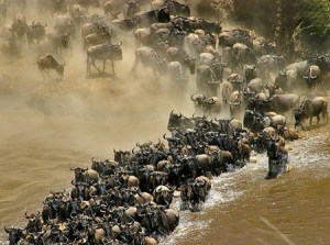 The one I liked the best, though, was the one about the migration of the gnus (wildebeests, if you’re South African.)  It still wows me that one minute there’s this big herd of gnus, just hanging out on the Serengeti.  Then, one of them turns to his buddy and says, “Man, this place is totally lame.  I’m going south.”  Suddenly a couple of million herbivores are on the move.  Without thought or discussion – they’re just going — and dragging zebras and antelope with them.